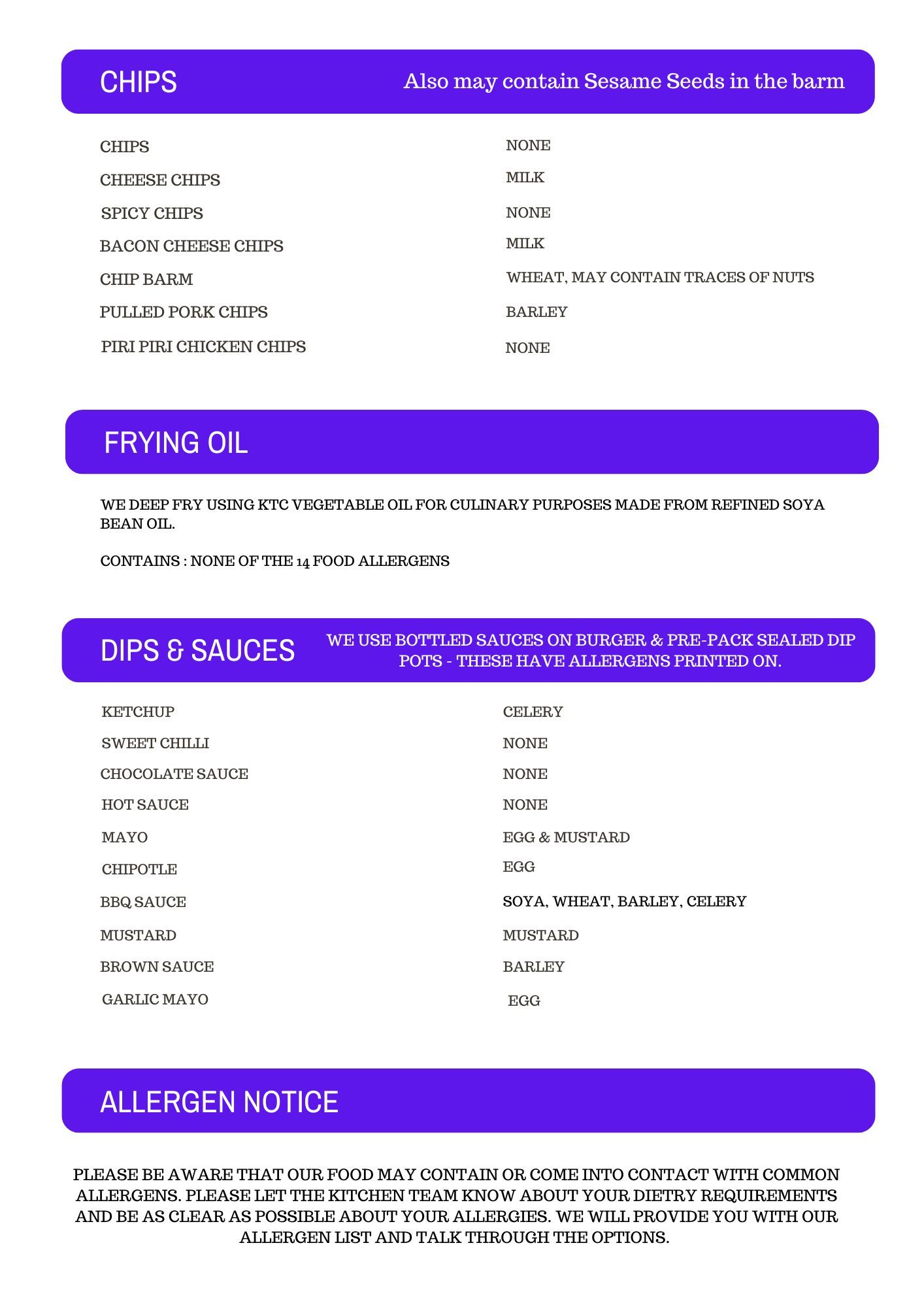 PLEASE ASK STAFF FOR ALLERGY INFO AND MAKE SURE YOUR SERVER IS FULLY AWARE OF ANY DIETARY REQUIREMENTS. PRODUCTS MAY CONTAIN NUTS. LIST OF ALLERGENS CAN BE REQUESTED AT THE BAR